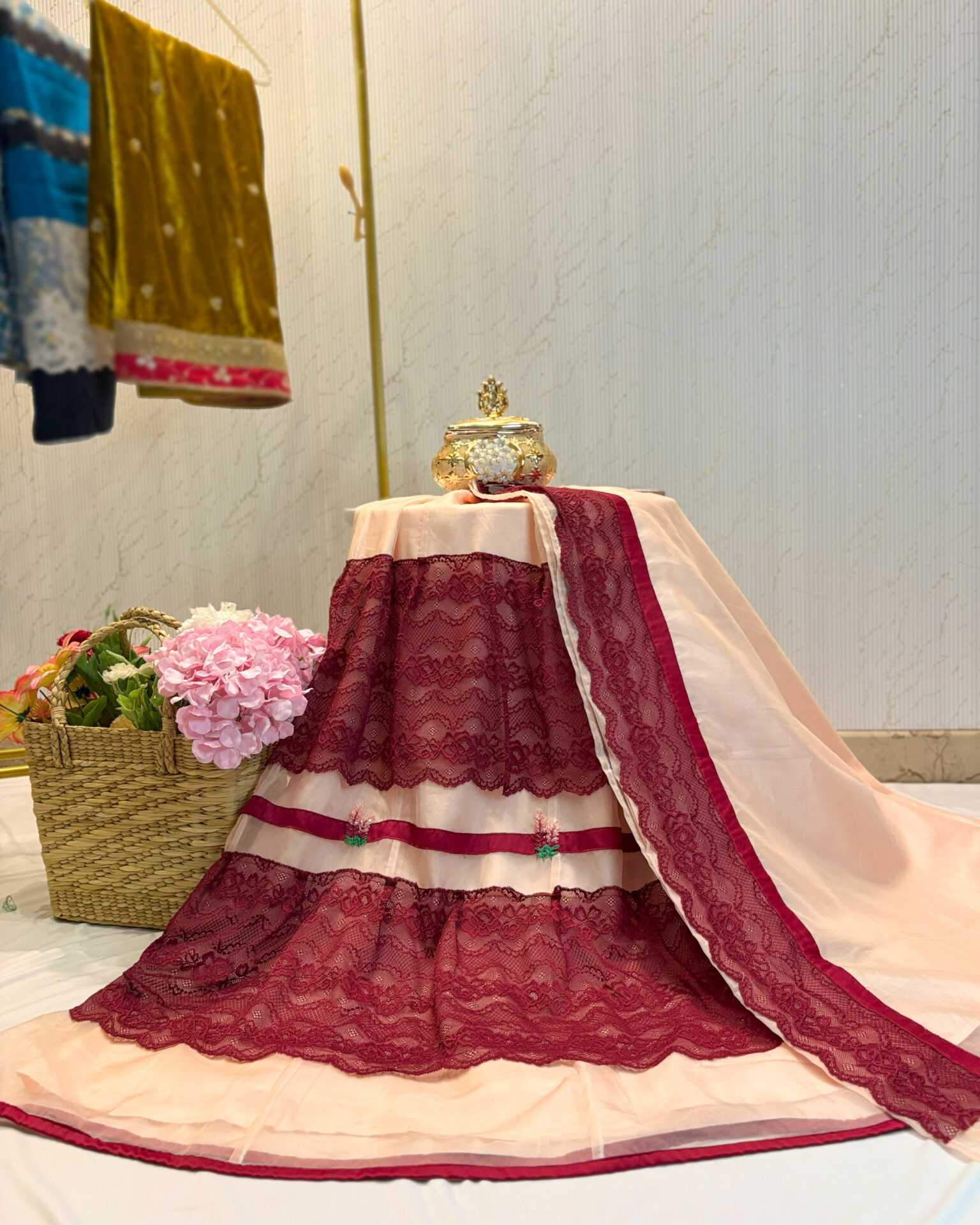 Fabric: Premium soft organza with Chantilly laces from Turkey with delicate hand embroidery.