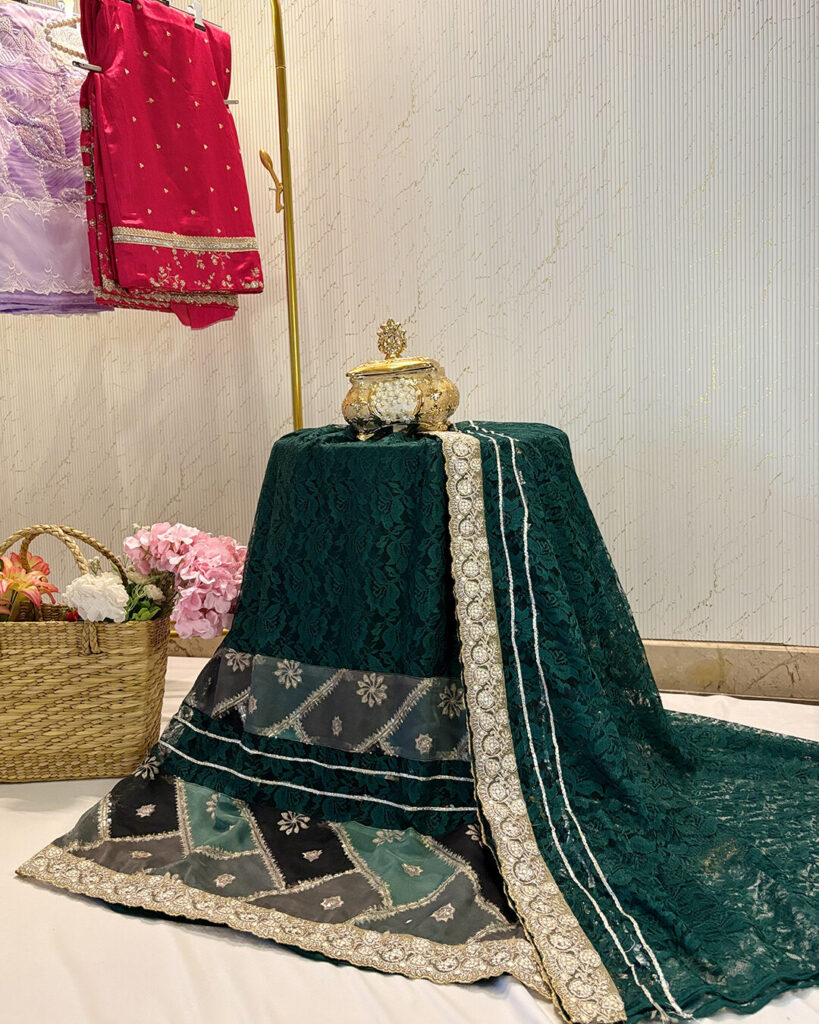 Paired with a minimally adorned pardi, this ensemble creates the perfect harmony between grandeur and sophistication.