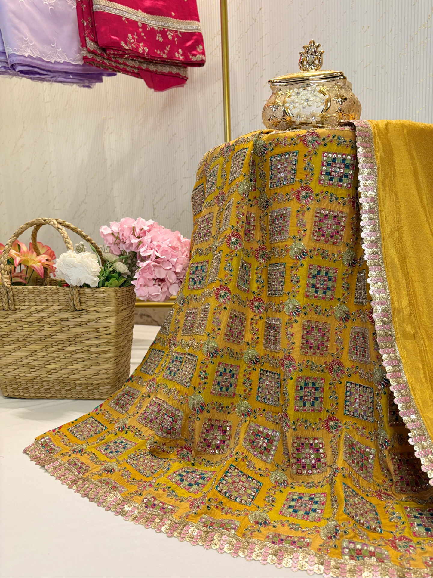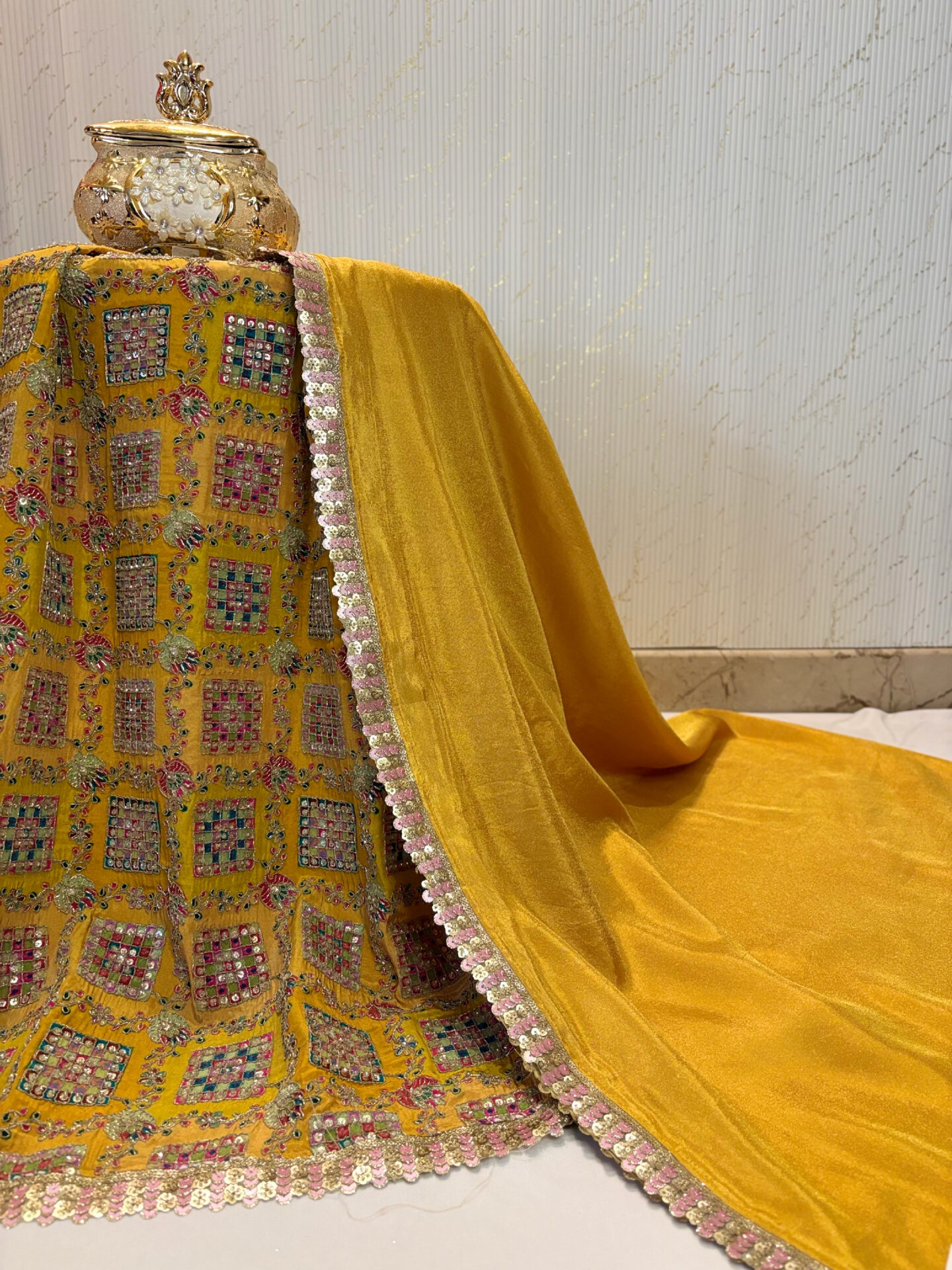 A fully worked mustard lehenga that celebrates luxury craft on pure silk.