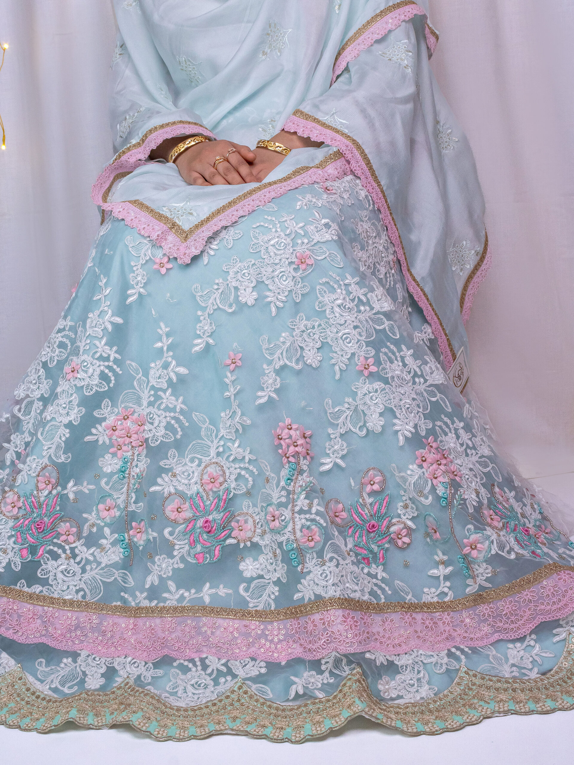 Lehenga Material: Richly decorated fabric with a heavy, graceful flare.